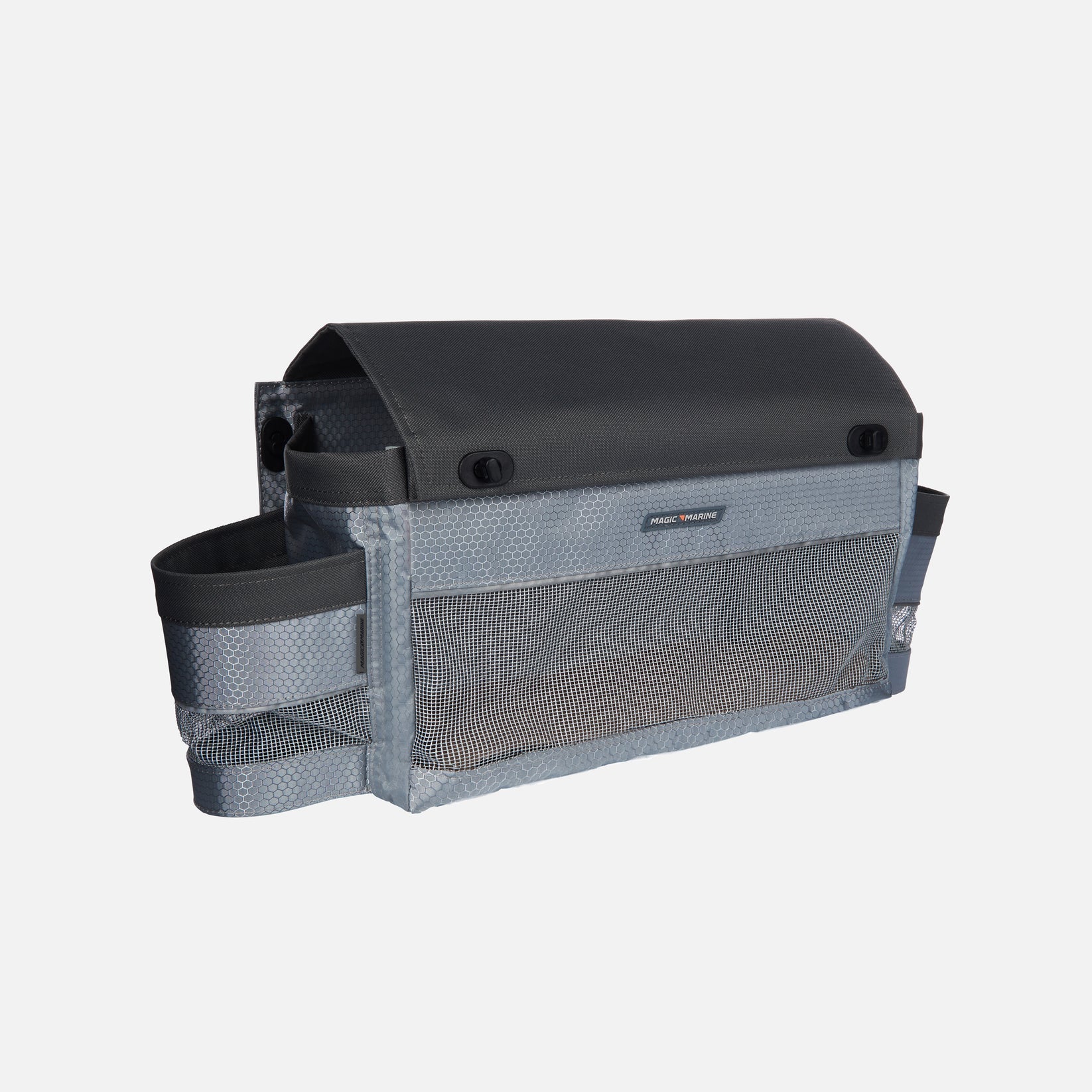 The protective lid shields lines from sunlight and spray, while the large mesh front panel ensures fast drainage and ventilation. Two integrated side cup holders provide convenient storage for drinks, tools, or small sailing accessories.